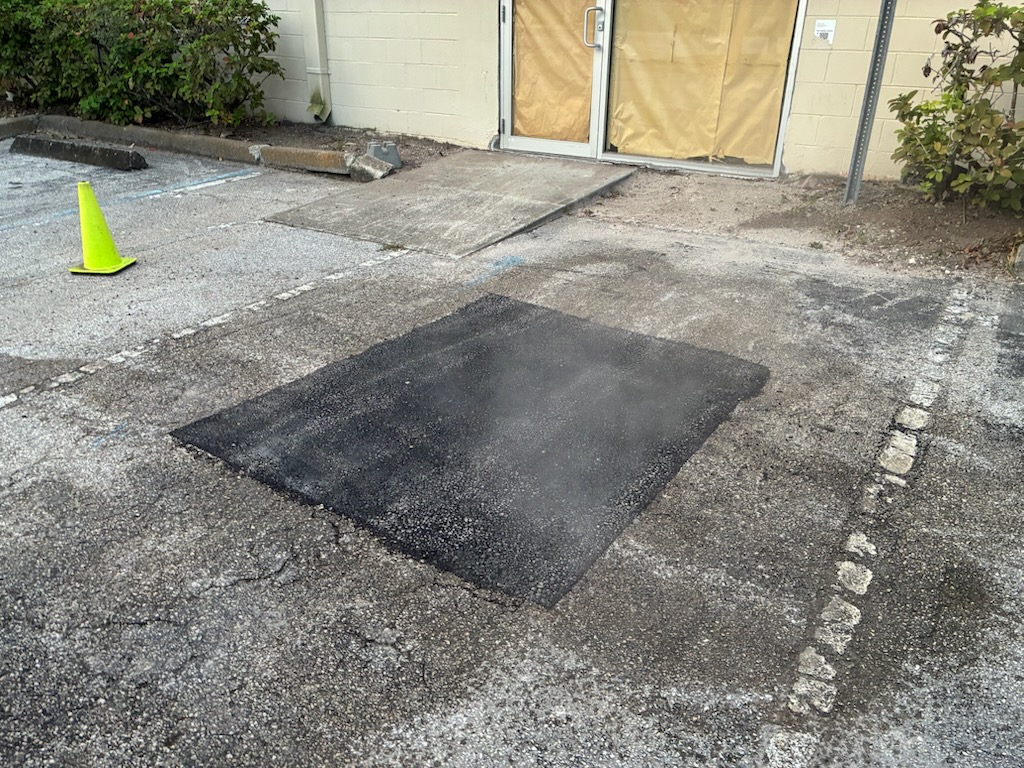 A damaged section of pavement near the building entrance was recently repaired to eliminate safety hazards and restore the area’s functionality. The work involved removing the deteriorated asphalt, rebuilding the base, and installing new material for a smooth, long-lasting surface. These repairs not only improve safety for vehicles and pedestrians but also enhance the overall appearance and extend the lifespan of the parking lot.