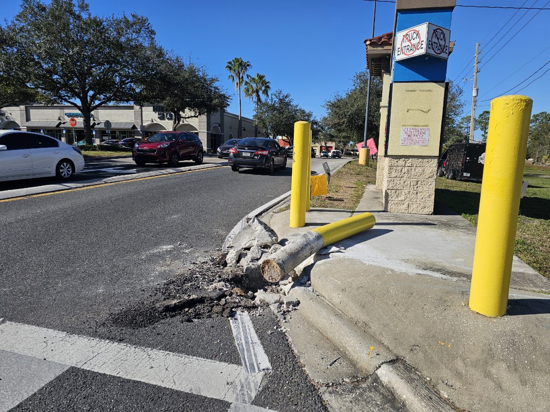 Team CSG recently completed bollard repairs at Metro Point in Orlando, Florida. The entrance bollard, which had been struck and damaged again, has been fully restored.